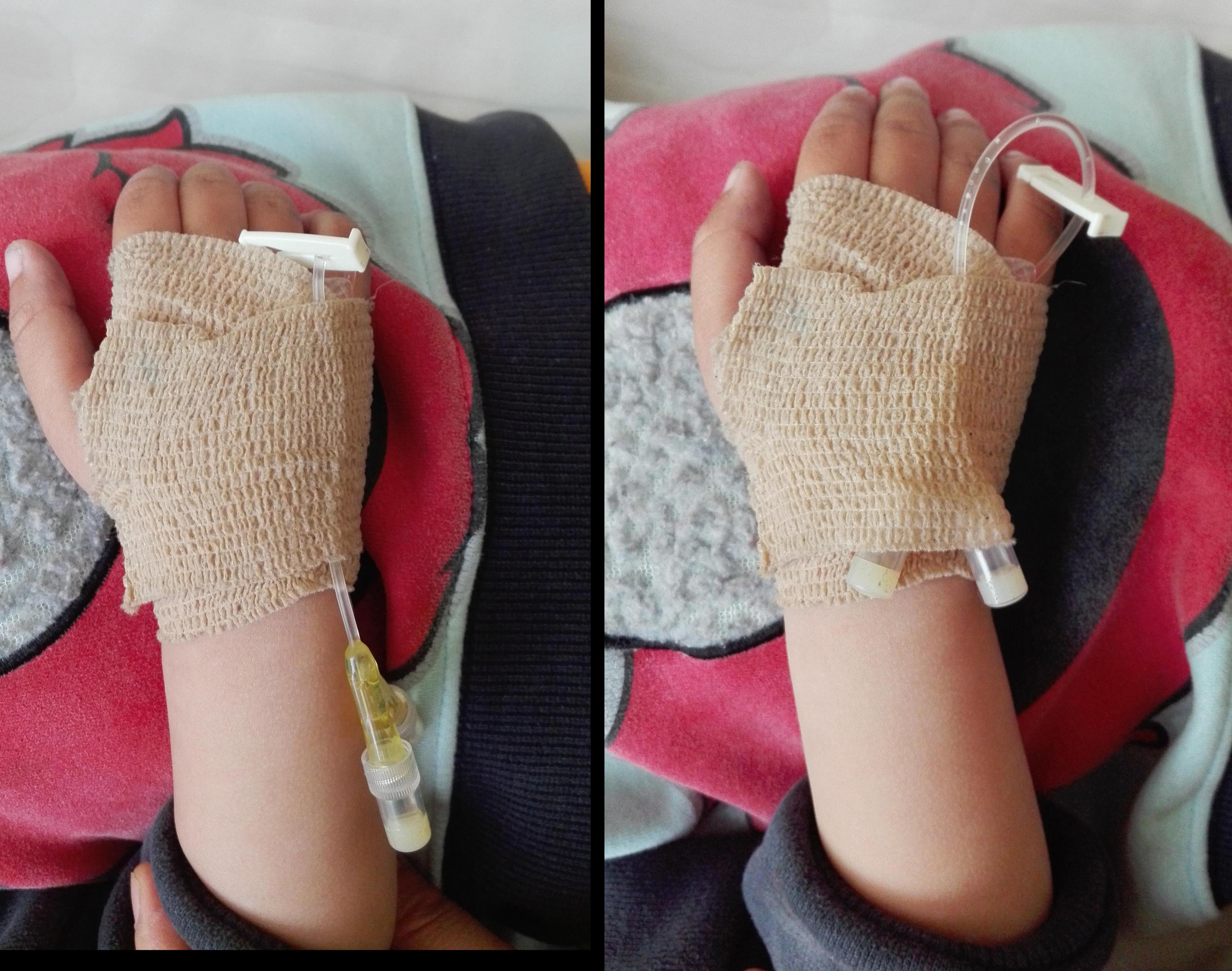 自粘弹力绷带表面涂有一层自我粘连却不与其他材料或皮肤粘连的粘性材料一天然橡胶,且纵向加入聚氨酯纤维以提供弹性,具有自粘性、高弹性、易撕性、服帖性、防水透气性等特点。患儿好动,活动量大,易哭闹,出汗多,透明敷贴常常固定不牢、易卷边。使用自粘弹力绷带后固定牢固,减少了由于敷贴卷边、松动而需要更换敷贴的次数,避免或减少了留置针的滑出,延长了留置针的使用时间;用自粘弹力绷带固定可减轻针头在血管内的摆动,降低了针头对血管壁的损伤,减少输液时液体外渗、针头脱出的现象。自粘弹力绷带有一定的防水作用,能很好地保护无菌敷贴,有效延长留置针的留置时间。使用自粘弹力绷带后,留置针的尾端固定更牢,避免或减少了由于枕头、盖被、穿脱衣服、患儿手拉等各种外力对留置针的摩擦,防止机械性静脉炎及外渗或脱管的发生,起到了保护血管、安全留置的作用。自粘弹力绷带拆除方便,避免了普通胶布固定时与头发、皮肤的粘连,不引起患儿的痛苦;手部使用自粘弹力绷带,可以让大拇指和其余四指自然分开,患儿可以随意抓取东西玩耍,不影响活动;足部使用自粘弹力绷带,确保了患儿下肢的功能位置;另外由于它的不透明能减轻留置针对患几的视觉刺激,避免引起恐惧和紧张。自粘弹力绷带使用后患儿舒适,乐于接受,降低了,意外拔管的町能性,同时也降到了家属的看护难度。总之,使用自粘弹力绷带后,患儿家属不必担心透观贴膜卷边、松脱或因穿脱衣服、日常活动牵拉而致留置针脱出,也不用担心留置针会被患儿拔除,延长了留置针的使用时间,尤其是6岁及6岁以下患儿效果更加明显。成人使用也有效避免了因胶布固定带来的过敏、撕扯疼痛、脱落等情况的风险。在使用自粘弹力绷带的过程中,须注意松紧适宜,过紧易引起血液循环不畅或局部皮肤受损,过松则造成留置针松脱。护士要加强巡视,每次输液前须检查患儿局部肢体有无肿胀现象,如有异常及时更换处理。防止穿刺部位感染,尤其夏天,天气炎热出汗多容易导致感染,要加强观察,可轻轻掀开弹力绷带一厕检查穿刺部位有无红肿、水泡、皮炎等异常现象并及时处理。