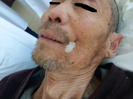 患者高某,男,76岁,因左侧桥小脑角区占位及左侧三叉神经痛入院。患者及家属拒绝行颅内占位切除手术,因继发性三叉神经痛曾行三叉神经下颌支封闭术,术后1年疼痛复发,疼痛剧烈难忍,严重影响日常生活,遂来诊。入院后行颅脑CT薄层扫描,利用三维制图软件制作患者左侧面部外形的导板及通道(图1、2),利用3D打印机打印导板用于手术(图3)。术中利用导板通道定位穿刺点(图4),沿通道方向穿刺进入左卵圆孔外侧(图5),测试见穿刺针末端位置准确。利用射频仪热凝毁损神经半月节,初始温度60℃,温度间隔5℃,逐步提升温度,最高温度85℃,每次作用时间1分钟。术中术后患者未出现并发症,术后患者左侧疼痛症状完全消失,术后第2天出院。