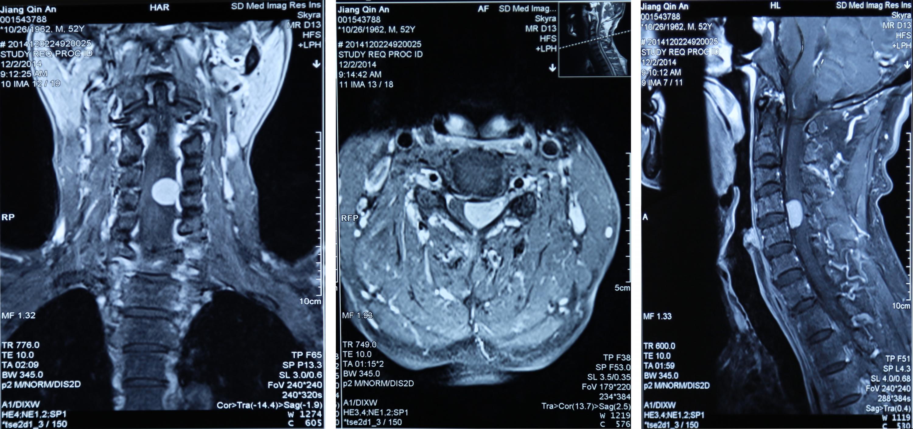 1月6日,李某慕名来到我院找副院长徐勤伟诊治,最终决定在市中医院接受手术。颈椎磁共振扫描显示:C4/5颈髓占位,肿瘤大小1.8×1.5×1.0cm。1月8日,李某在全麻下行颈髓肿瘤镜下全切除,手术历时6个小时。“麻醉醒了后我就感觉身上轻松了,手脚活动也灵便了。”李某说。