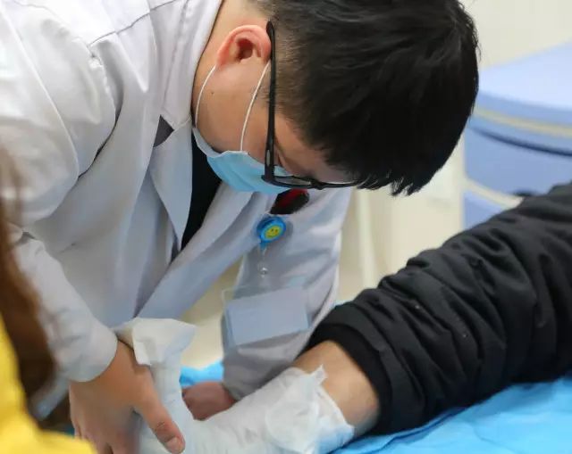 晚上8点07分,在骨伤科治疗室,医师丁聪为一名脚趾砸伤患者包扎石膏绷带。
