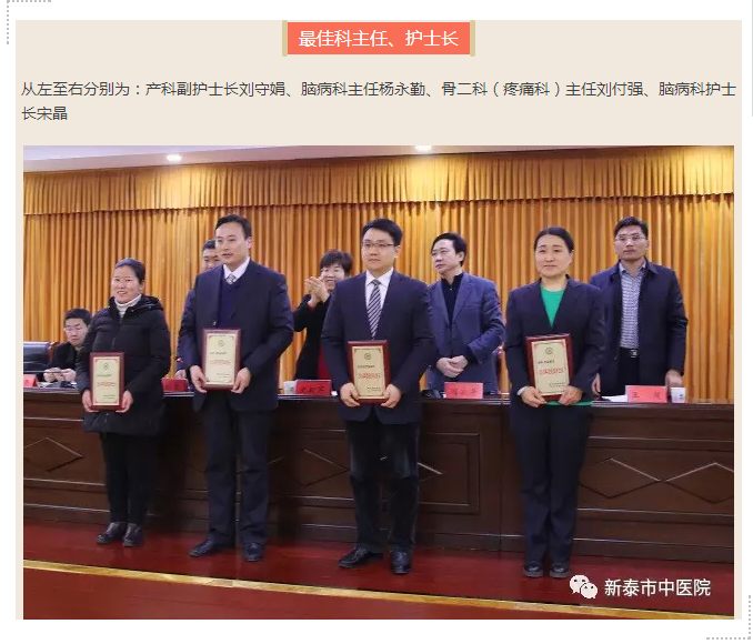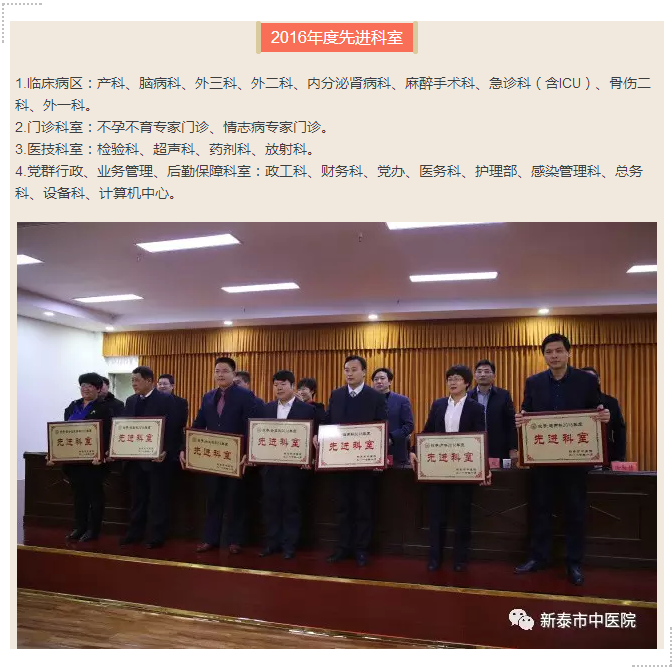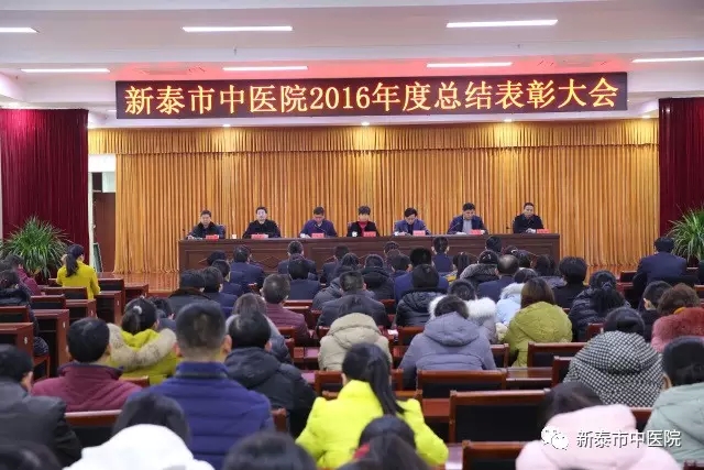 1月23日晚,新泰市中医院2016年度工作总结表彰大会在一号会议室隆重召开。市卫生计生局党委副书记史新芹参加会议并讲话,我院院长闫家平讲话。会议由副院长李振爽主持,党委副书记王超宣读表彰决定,副院长林永年、徐勤伟、吴修才及全体中层、中共党员和受表彰的先进集体、先进个人200余人参加会议。