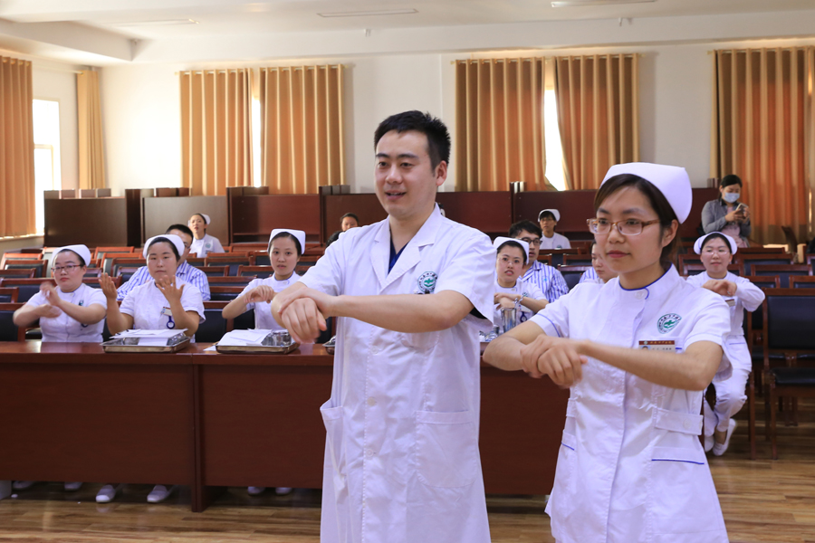 竞赛当天是全球手卫生日,院感科的同志带领全体人员进行了六步洗手法表演,美丽的白衣天使进行了护理礼仪展示。李振爽对选手拔火罐法操作作了精彩点评。(护理部)