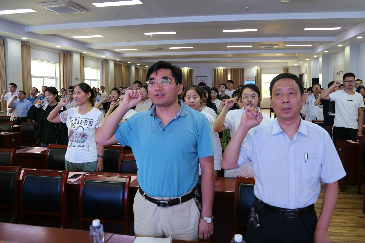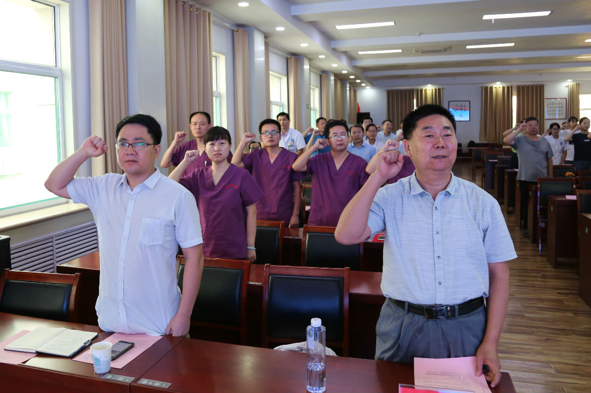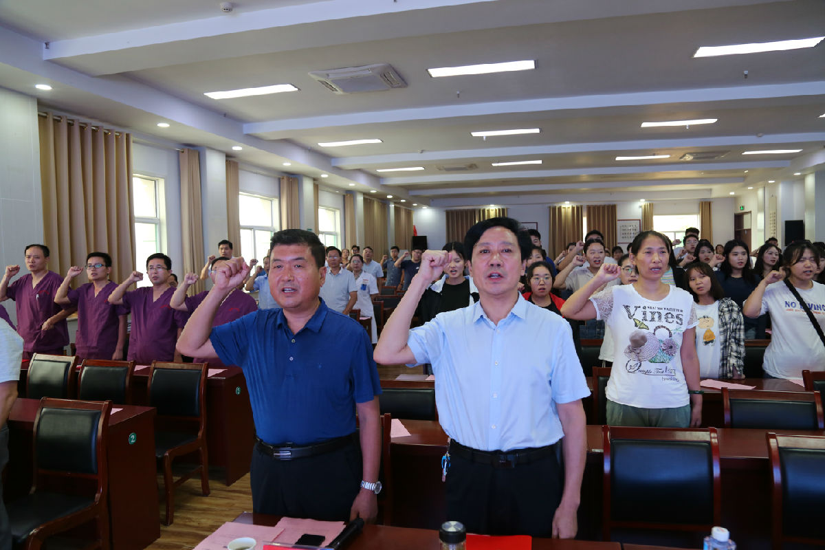 最后,大会举行了庄严的宣誓仪式。在优秀医师代表成志凤、杨元庆的带领下,全体参会人员集体起立,举起右手郑重宣誓了《中国医师誓词》和《新泰市中医医院员工誓词》。