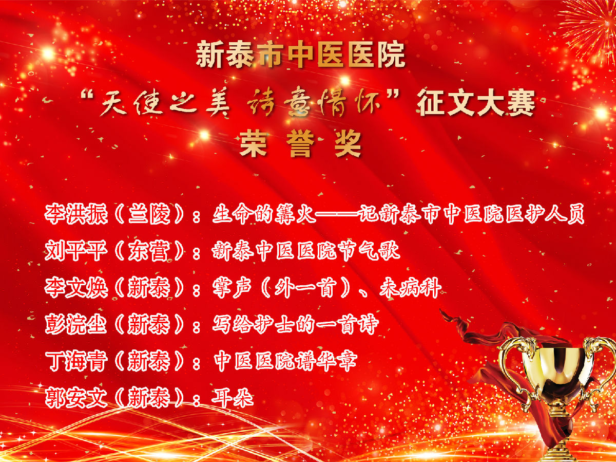 为进一步丰富医院形象内涵,通过文学的手段向社会更广泛深入地展现新泰市中医医院的人文价值和天使情怀,2019年7月13日至8月20日,新泰市中医医院联合泰安市诗歌学会举办“天使之美,诗意情怀”诗文大赛。征文要求以“天使之美,诗意情怀”为主题,通过限散文、诗歌两类体裁,围绕新泰市中医医院的人与事展开。