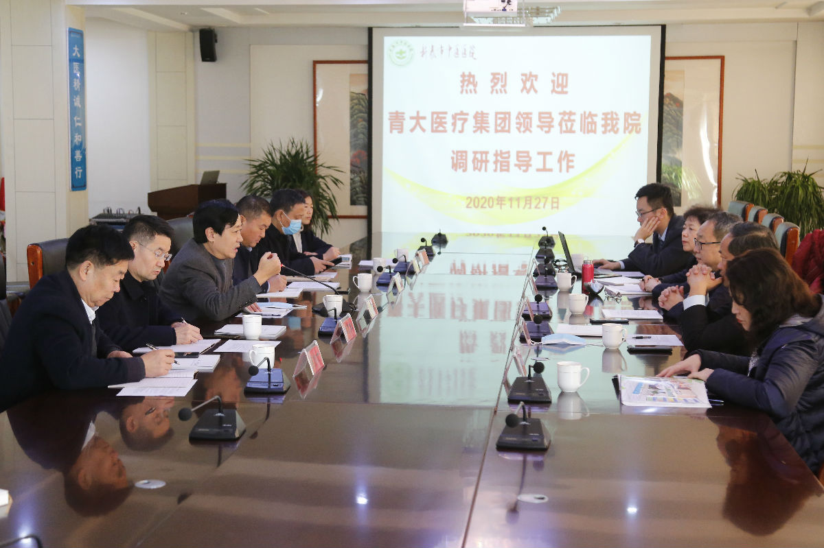 11月27日,青岛大学医疗集团常务副书记姜卫东姜卫东、副院长贾绍友一行五人来我院调研指导工作,我院院长闫家平、副院长李振爽、副院长林永年、徐勤伟、吴修才、党委委员孙静陪同。姜卫东等领导观看了我院专题片,听取了我院工作汇报,与我院领导班子成员进行座谈,对我院工作给予充分肯定,并就医院管理、学科建设、医疗服务等工作提出了明确要求。(党办)