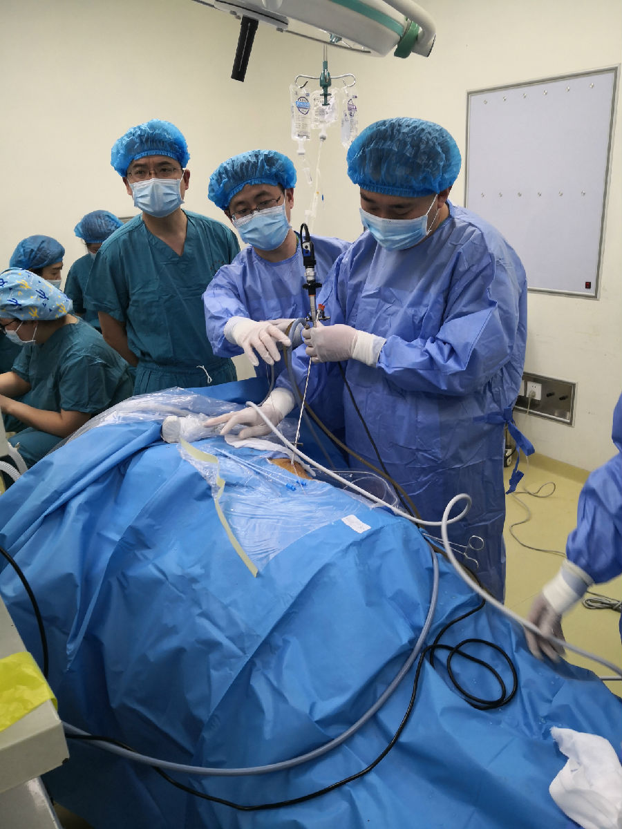 今年的3月上旬,肺小结节门诊接诊了一个患者,是六旬王大叔, 2年前王大叔因“胸部钝挫伤”在周边医院住院行胸部CT检查时发现“双肺多发结节”,后辗转多家医院复查,见右肺上叶结节较前增大,听说我院有“智能肺小结节分析诊断系统”和“肺小结节门诊”,带着咨询的态度来到了我院肺小结节门诊。胸外科杨方良主任接诊了这个患者,在我院复查胸部CT后,“智能肺小结节分析诊断系统”分析此患者为双肺多发结节,双肺共7个结节。将患者分析结果与前两年胸部CT比较,发现虽然患者双肺结节较多,但有明显变化的是右肺上叶近肺裂处一个直径达1cm结节,从影像学来看,有恶性的可能,建议手术治疗,其他结节近2年无明显变化,体积较小,位置较深,暂观察处理。同时胸部CT发现“右侧输尿管上段结石并右肾盂积水”,仔细询问病史,病人既往有泌尿系结石病史2年,但一直没有明显不适。在门诊详细向患者及家属讲明了肺部疾病及输尿管结石治疗的必要性及我们医院的微创手术治疗方法,患者及家属同意入住我院。考虑到王大叔2种疾病都需要手术治疗,经完善术前检查后,外二科邀请了麻醉科等科室进行了多学科及多专业会诊。经过讨论,根据患者病例特点,外二科团队决定实施同期胸腔镜纯单孔右肺病变切除术+经皮肾镜气压弹道输尿管结石碎石取石术。同期手术是两种或两种以上术式同时进行,一次完成的手术。相比分期手术来说,同期手术是有优势的,优势在于一次住院,一次麻醉,解决至少两方面的疾病。分期手术患者需要两次麻醉,住院时间延长,既增加了麻醉风险,又增加了患者经济负担。但是同期手术是有严格适应症和禁忌症的,外二科团队充分考虑到患者泌尿系结石没有感染征象;肺部肿瘤较小,无转移;患者身体状态较好,术前检查无手术禁忌症,所以选择了同期手术。既往如果同期开刀手术,2个手术各需要20cm左右的刀口,由于创伤大,是无法保证同时进行的。