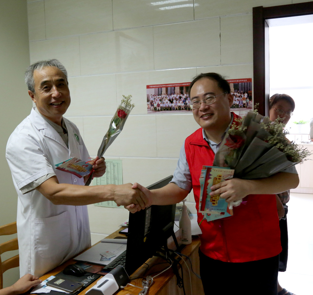 志愿者们到门诊和病房为值班医师送上一束鲜花和一份贺卡,表达对医师们的衷心感谢和美好祝愿!
