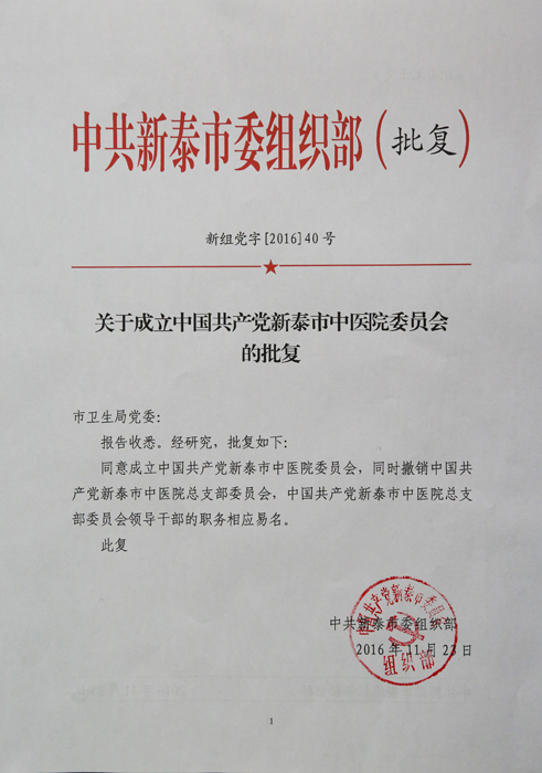11月23日,中共新泰市委组织部下发《关于成立中国共产党新泰市中医院委员会的批复》(新组党字[2016]40号),同意成立中国共产党新泰市中医院委员会,同时撤销中国共产党新泰市中医院总支部委员会,中国共产党新泰市中医院总支部委员会领导干部的职务相应易名。