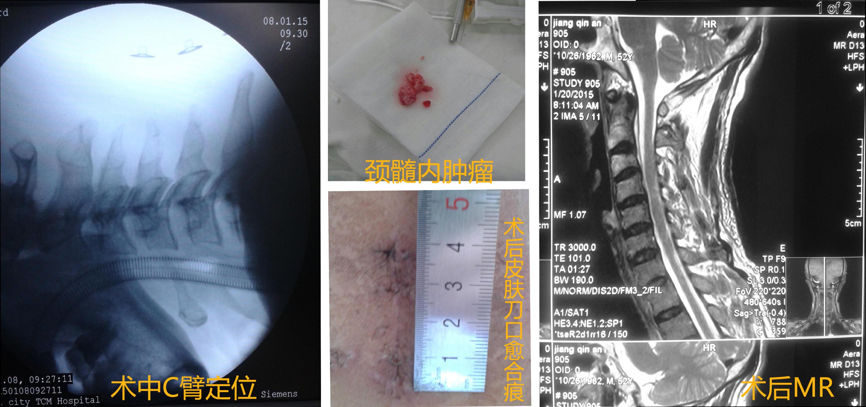 1月6日,李某慕名来到我院找副院长徐勤伟诊治,最终决定在市中医院接受手术。颈椎磁共振扫描显示:C4/5颈髓占位,肿瘤大小1.8×1.5×1.0cm。1月8日,李某在全麻下行颈髓肿瘤镜下全切除,手术历时6个小时。“麻醉醒了后我就感觉身上轻松了,手脚活动也灵便了。”李某说。