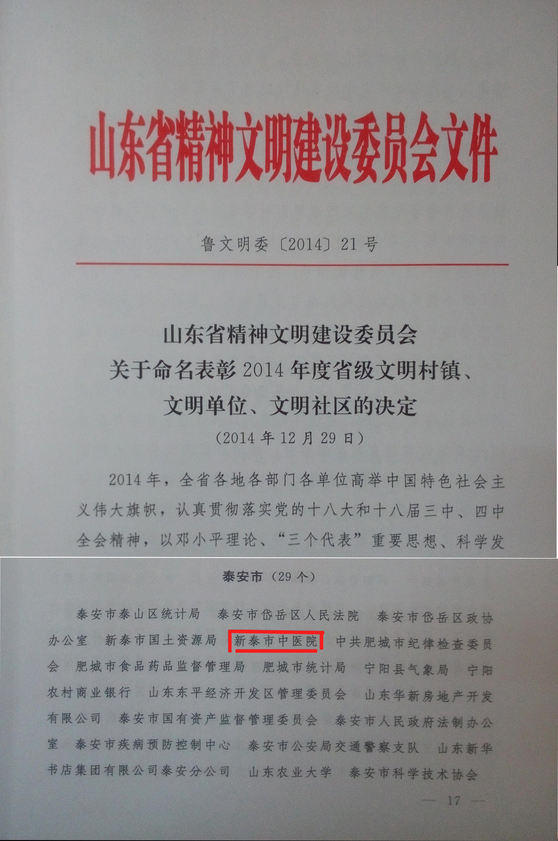 近日,山东省“2014年度省级文明村镇、文明单位、文明社区”评选结果揭晓,我院喜获山东省“省级文明单位”称号。