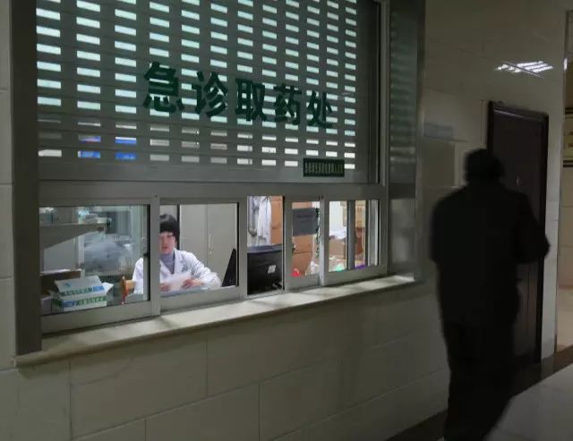 晚上7点22分,病患走过急诊取药处。室内,工作人员在查对单据。