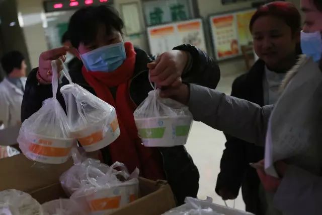 晚上8点50分,工会副主席鲍庆磊、行政总值班王木刚和工作人员开始发放医院为值班人员精心准备的年夜饭。