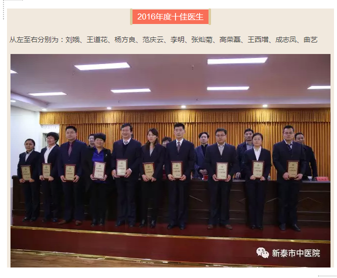 1月23日晚,新泰市中医院2016年度工作总结表彰大会在一号会议室隆重召开。市卫生计生局党委副书记史新芹参加会议并讲话,我院院长闫家平讲话。会议由副院长李振爽主持,党委副书记王超宣读表彰决定,副院长林永年、徐勤伟、吴修才及全体中层、中共党员和受表彰的先进集体、先进个人200余人参加会议。