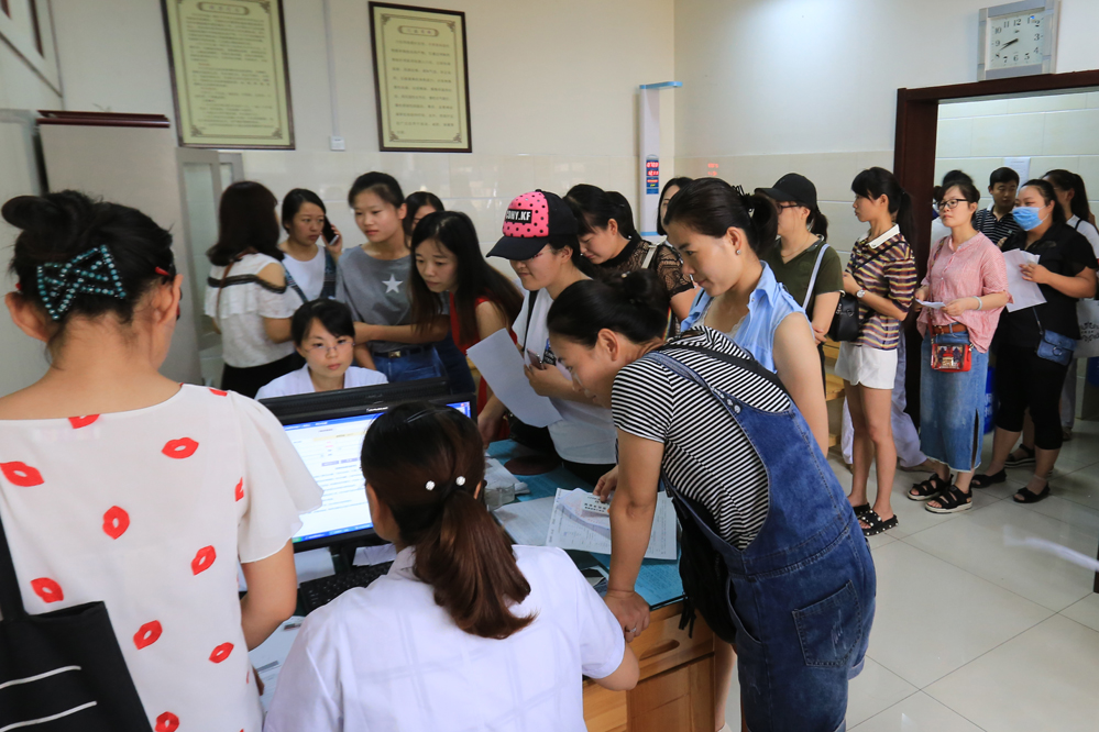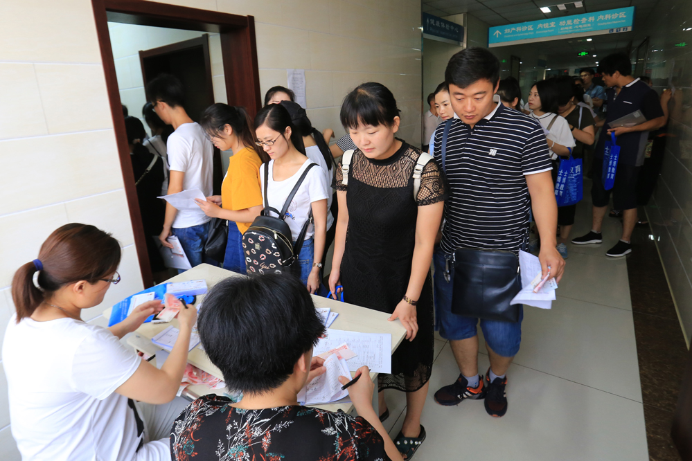 7月3日至5日,全市2017年教师资格体检工作在我院进行。我院高度重视,副院长李振爽亲自督导,医务科、护理部、财务科、查体中心抽调精兵强将,会同检验科、心电图室、放射科等,开展教师资格体检工作,3天累计检查600余人次。体检项目包括肝功、尿常规、心电图、胸透、身高、体重、视力、血压等。财务科为方便教师缴费,特地安排了临时收费处。检验科、心电图室、放射科等科室开通专门窗口,方便教师查体。全体医护人员每天从早上7点开始,加班加点工作,准确及时出具体检结果,及时把体检报告发放到体检的教师手中。 (查体中心)