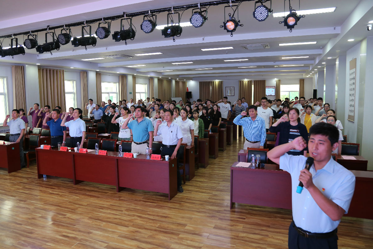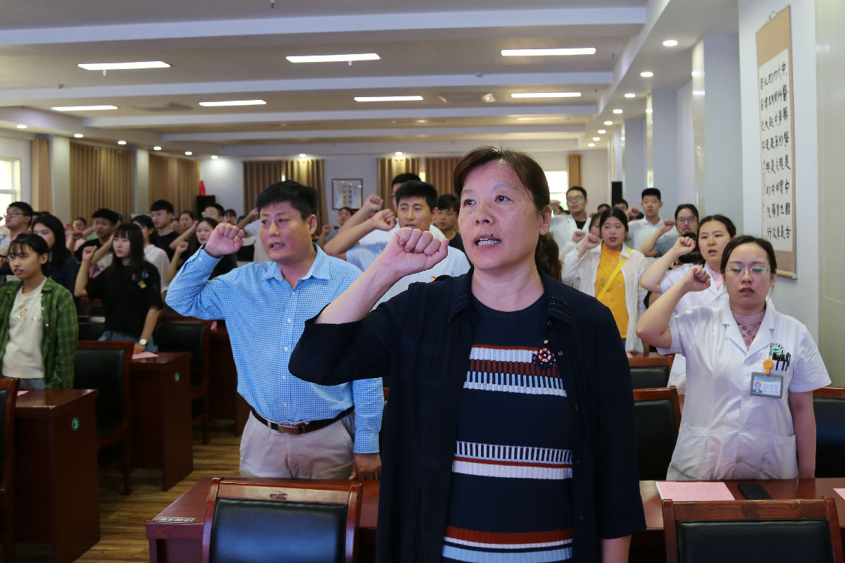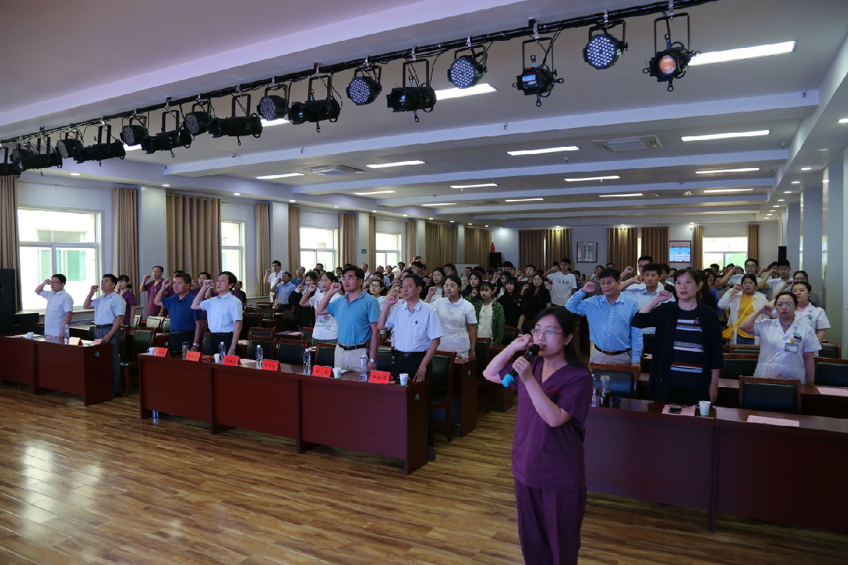 最后,大会举行了庄严的宣誓仪式。在优秀医师代表成志凤、杨元庆的带领下,全体参会人员集体起立,举起右手郑重宣誓了《中国医师誓词》和《新泰市中医医院员工誓词》。