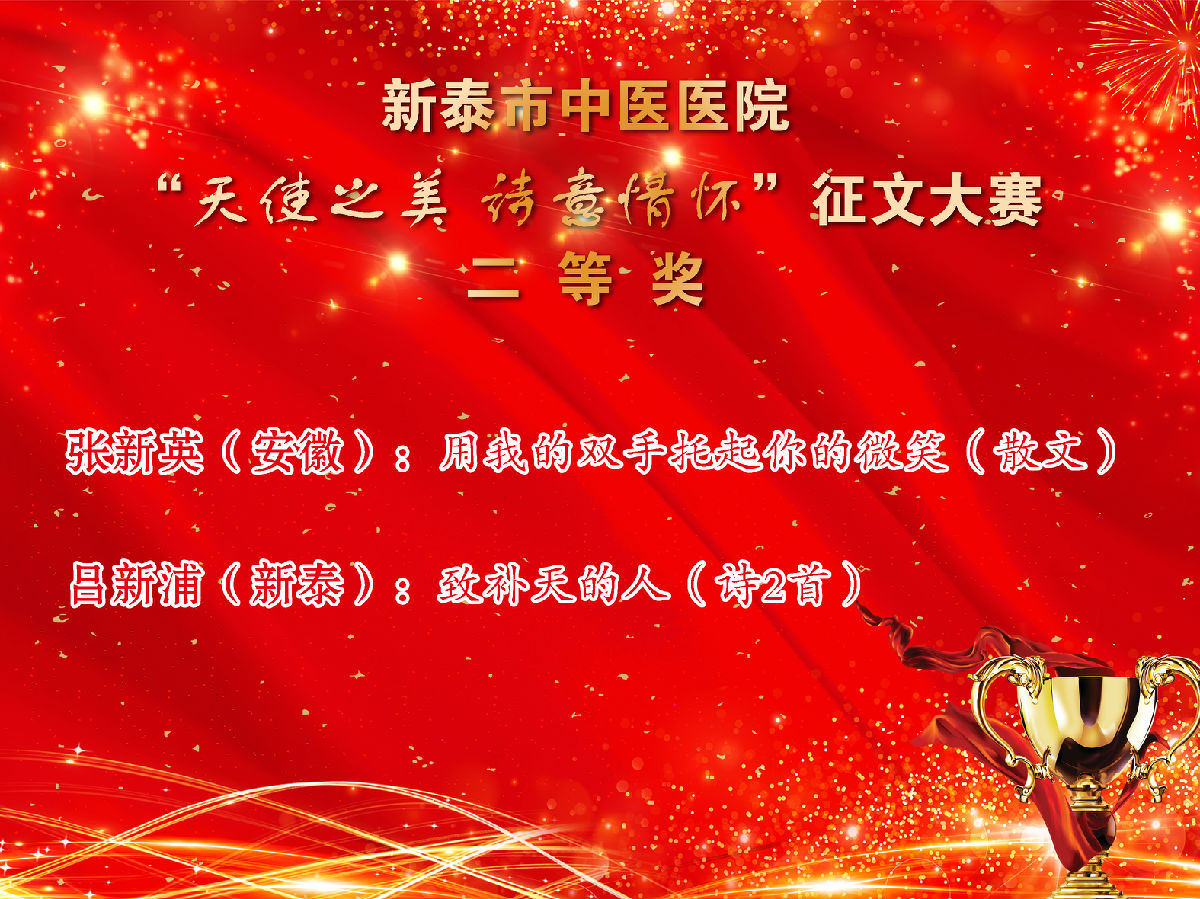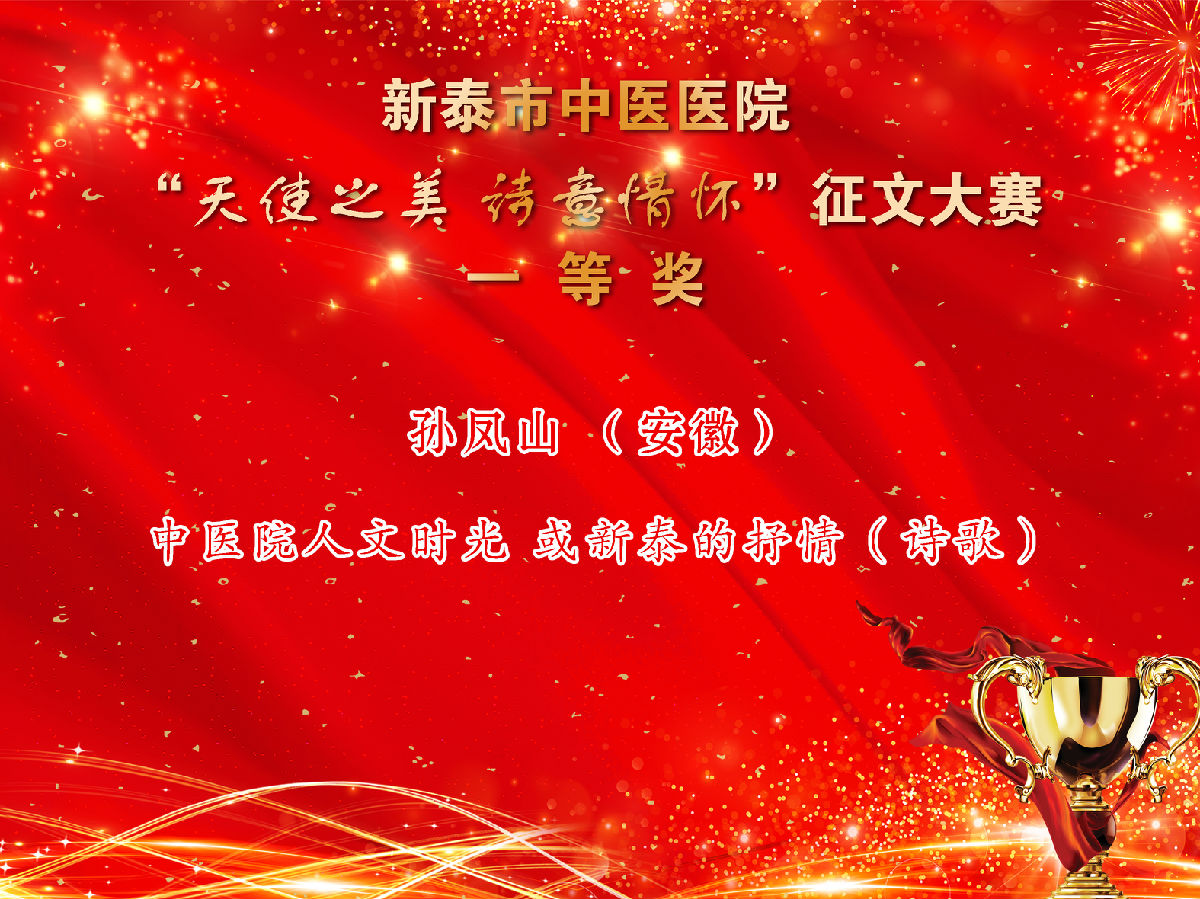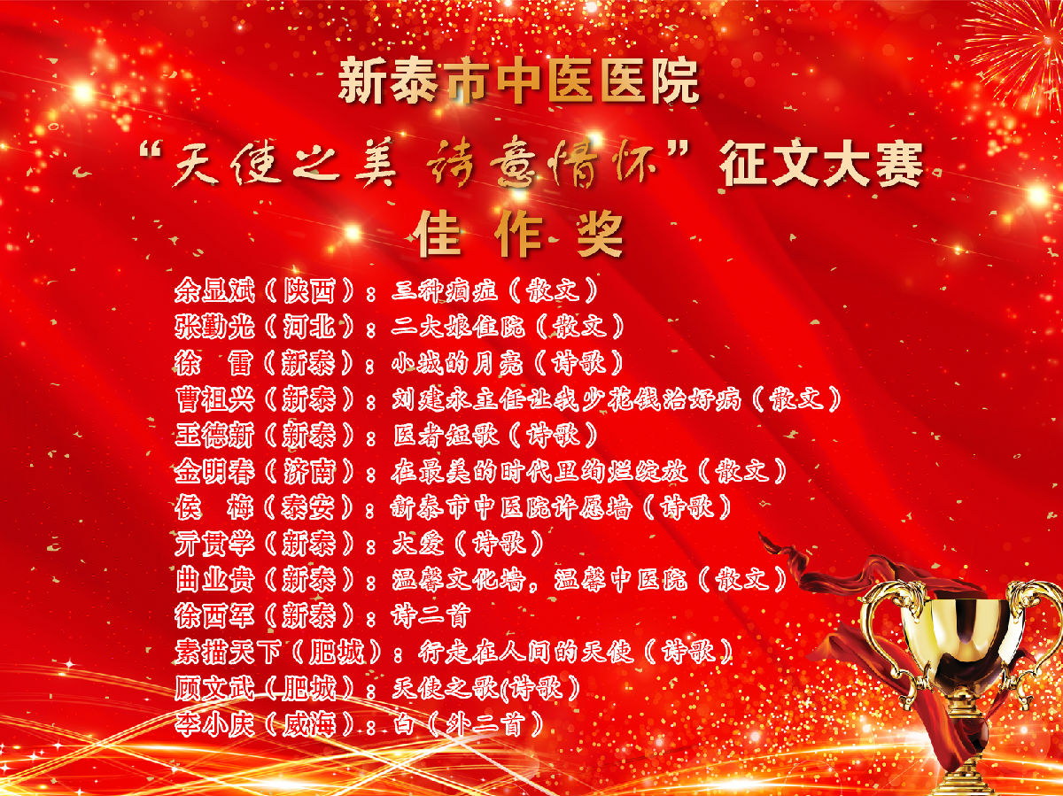 为进一步丰富医院形象内涵,通过文学的手段向社会更广泛深入地展现新泰市中医医院的人文价值和天使情怀,2019年7月13日至8月20日,新泰市中医医院联合泰安市诗歌学会举办“天使之美,诗意情怀”诗文大赛。征文要求以“天使之美,诗意情怀”为主题,通过限散文、诗歌两类体裁,围绕新泰市中医医院的人与事展开。