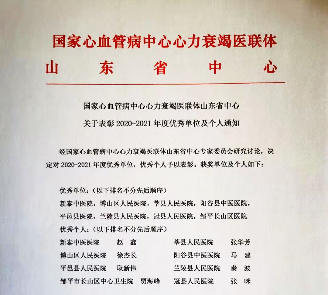 6月27日,国家心力衰竭医联体山东省中心2021年年会在济南召开。会上,新泰市中医医院被授予被“国家心力衰竭医联体山东省中心”评为年度优秀单位,医院心血管病科赵鑫医生被评为先进个人。心血管病科主任李鹏在会上介绍了工作开展情况。